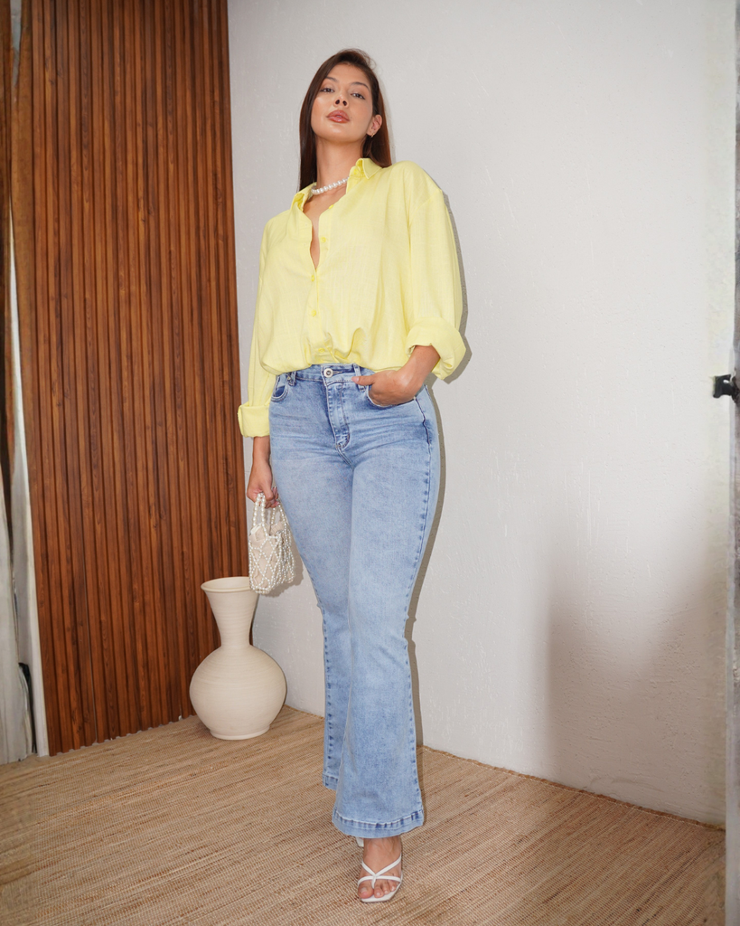 Confeccionado en tela stretch de alta calidad, este jean se ajusta perfectamente al cuerpo brindando comodidad y libertad de movimiento. Su diseño bota campana aporta un toque elegante y estilizado que alarga las piernas y combina con todo tipo de calzado, desde tacones hasta sandalias.