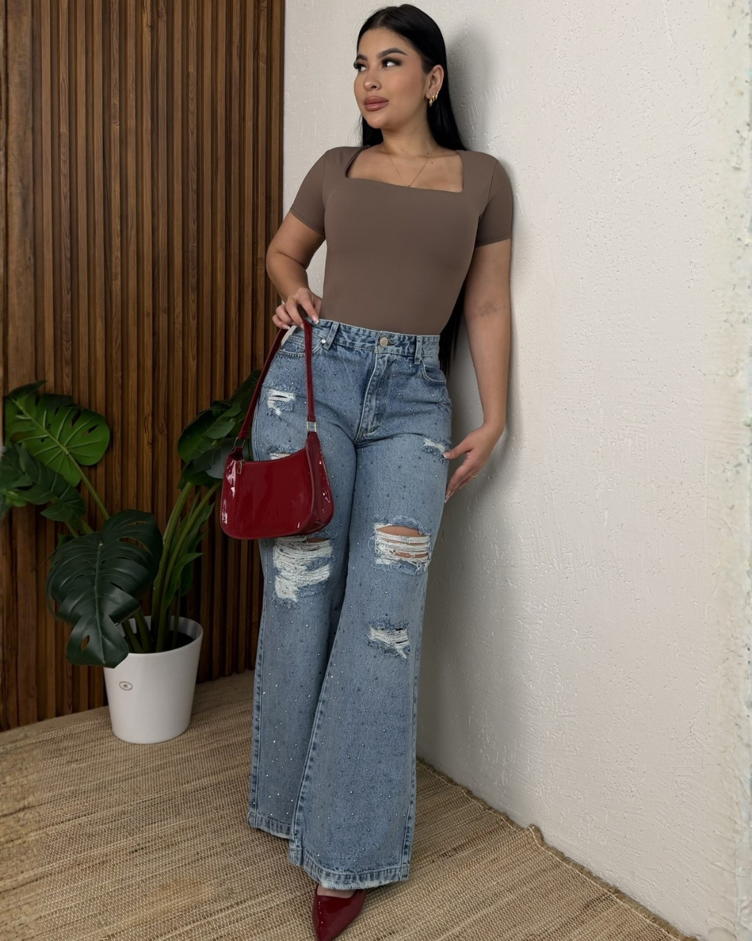Presenta detalles desgastados y sutiles aplicaciones decorativas que le aportan un toque urbano y actual, ideal para crear looks casuales con mucha personalidad. Su bota amplia tipo palazzo permite combinarlo fácilmente con tacones, sandalias o zapatillas para diferentes ocasiones.