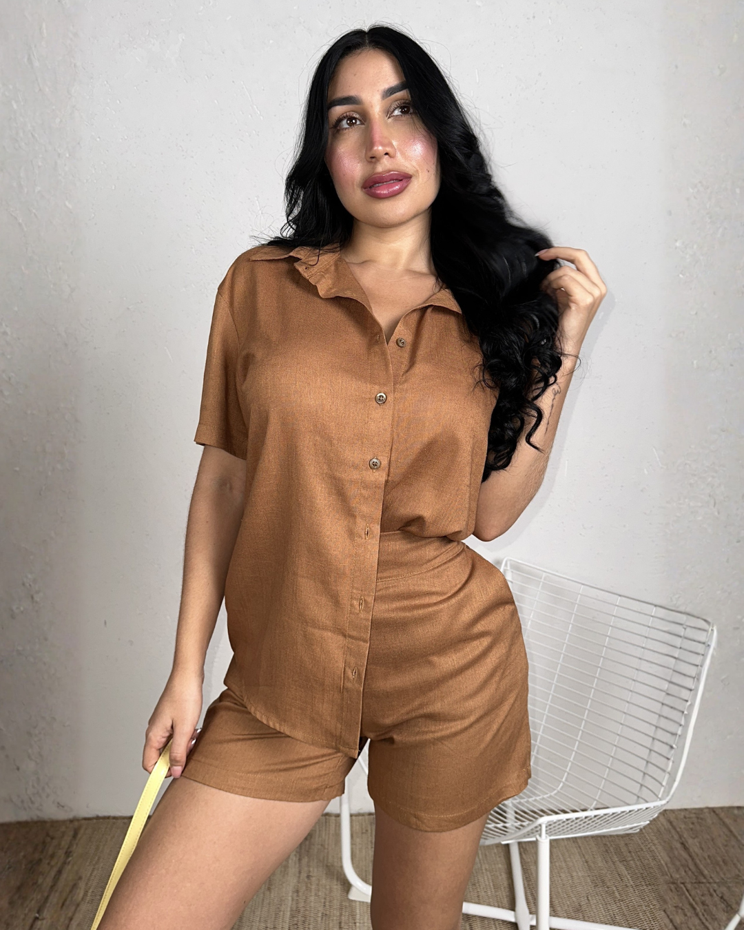 El equilibrio perfecto entre elegancia y frescura. Este set en lino Drabba combina una camisa de corte relajado con cuello clásico y botones frontales, junto a un short de tiro alto con bolsillos laterales, creando un look sofisticado y cómodo.