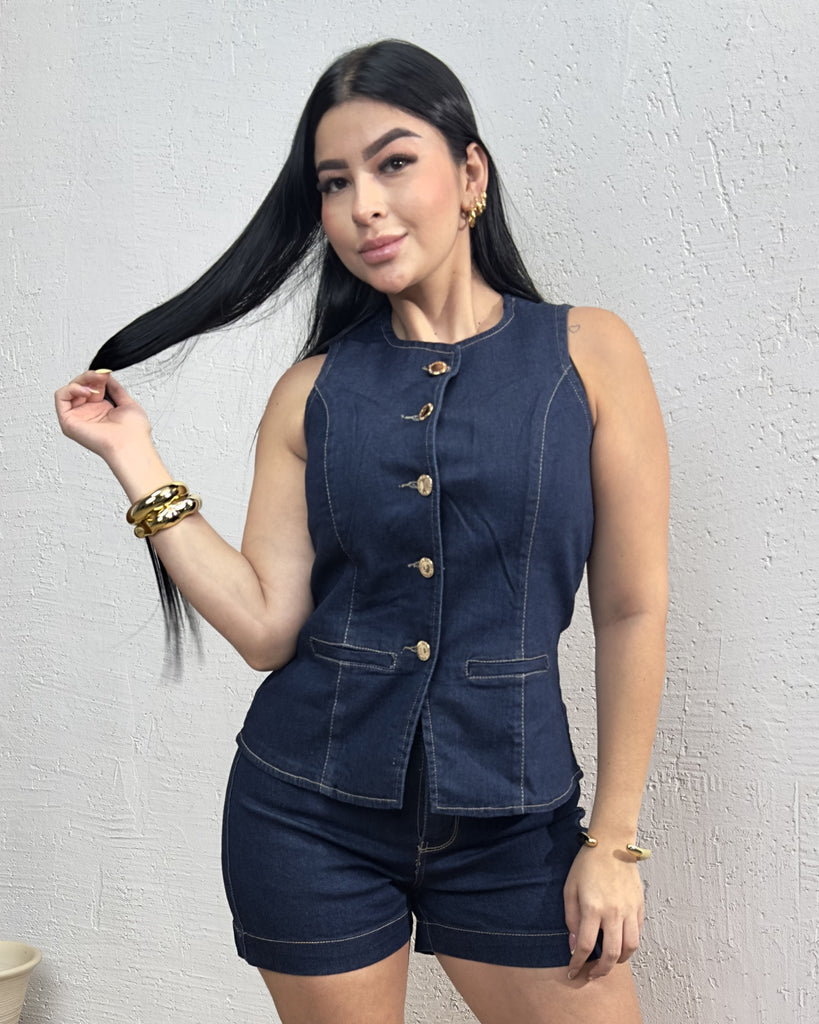 Este set en tela stretch combina un chaleco tipo corset con botones dorados y un short ajustado de tiro alto, creando una silueta femenina y estilizada. La tela elástica garantiza comodidad y libertad de movimiento sin perder la estructura del denim.